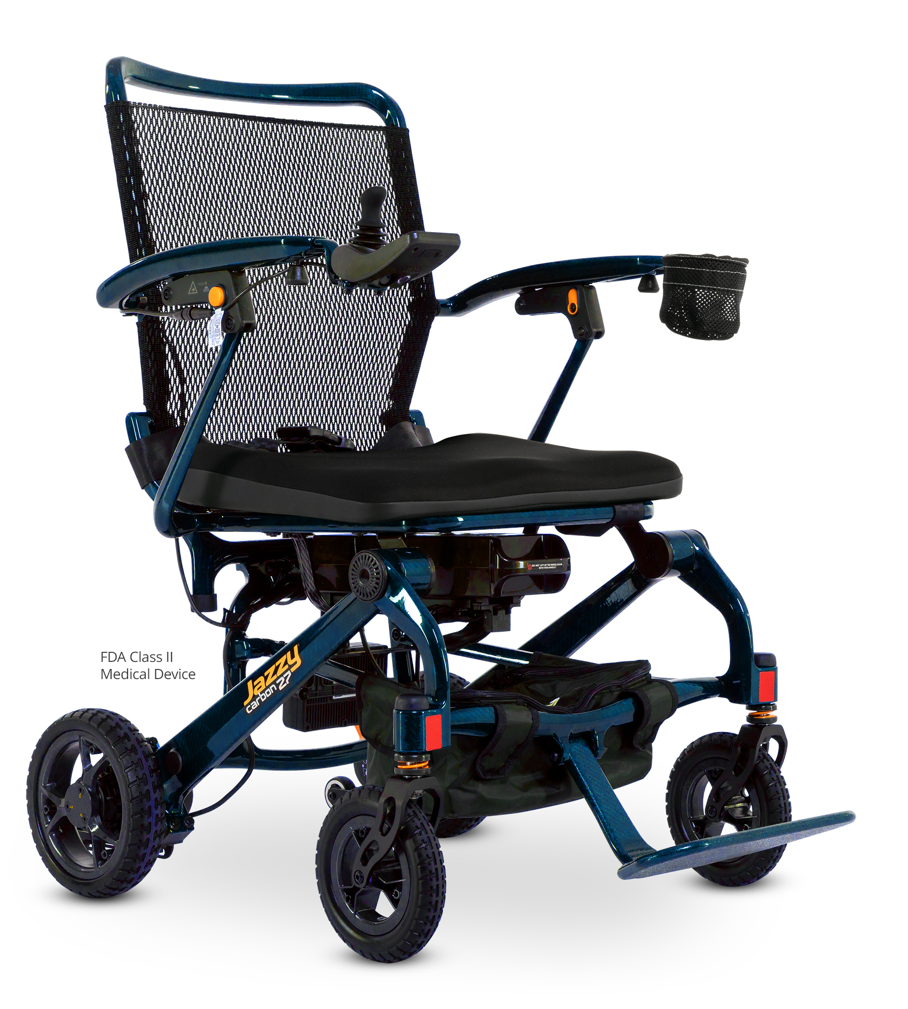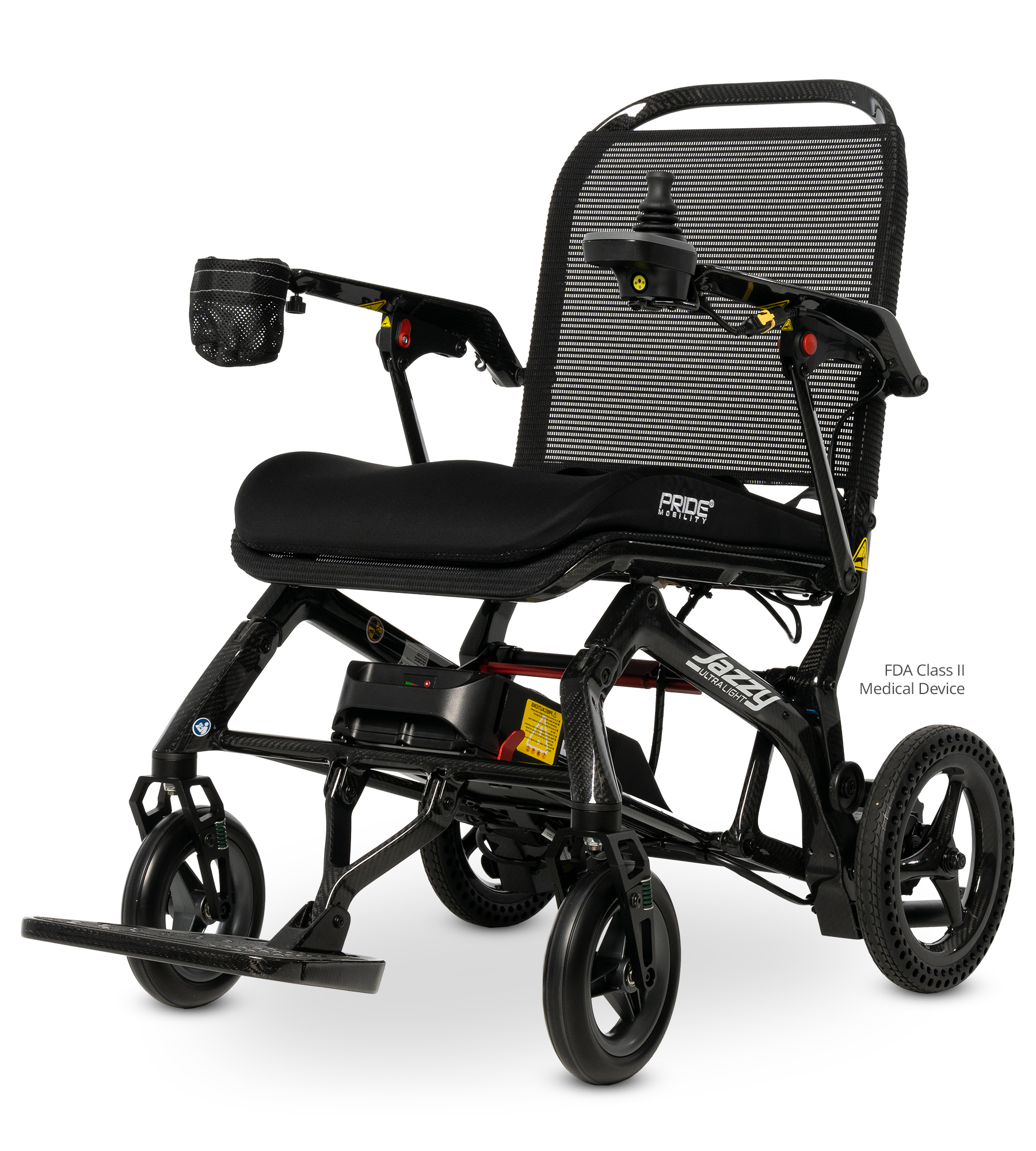 Heavy-duty capability meets lightweight travel! The Jazzy Carbon HD is a modern mobility marvel, combining a weight capacity of 400 lbs. with a total unit weight of only 32.2 lbs. without the battery. It folds quickly, is easy to pick up, and is built to last thanks to an advanced carbon fiber frame.